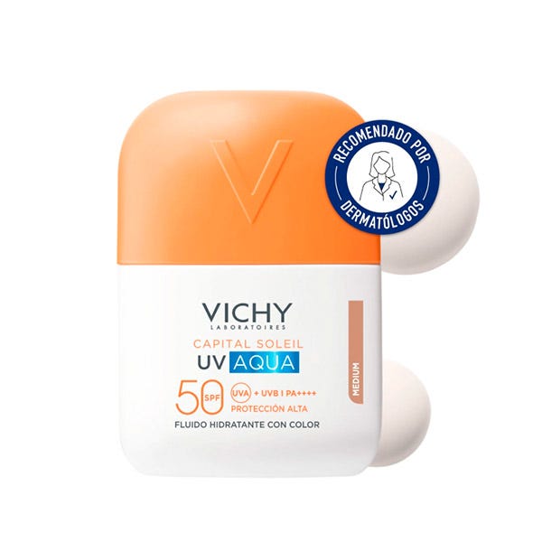 El Fluido Solar Facial con Color Vichy Capital Soleil UV Aqua FPS 50 es un fluido hidratante con protección solar muy alta que combina protección UV y uniformidad de la tez en un solo paso.