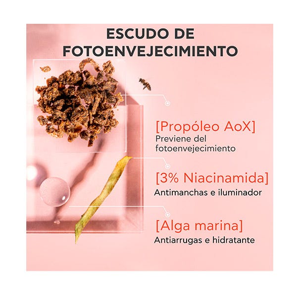 Previene el fotoenvejecimiento y ofrece una acción antipolución con propóleo AoX patentado.