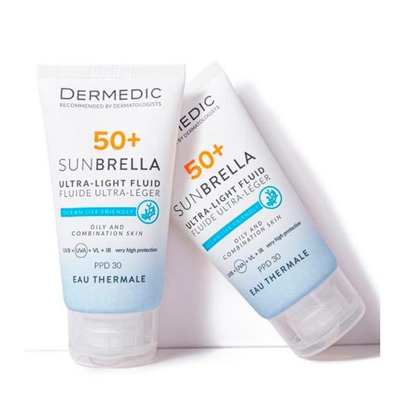 SUNBRELLA Fluido ultraligero SPF 50+ piel grasa y mixta ofrece una protección eficaz y duradera contra todo el espectro de radiación UV, VL/HEV e IR, ayudando a prevenir el fotoenvejecimiento y los daños celulares provocados por la exposición solar. Su avanzada fórmula con PPD 30 protege el ADN y el colágeno de la piel, reduciendo los efectos negativos de los rayos solares y previniendo el estrés oxidativo.