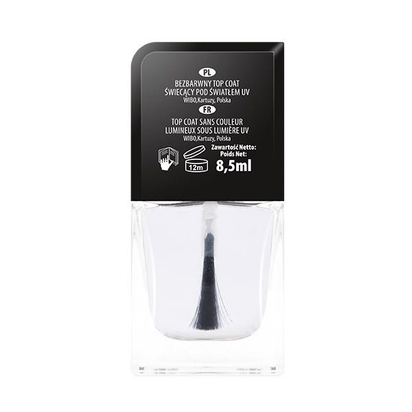 Top Coat de brillo para uñas que brilla con luz ultravioleta.