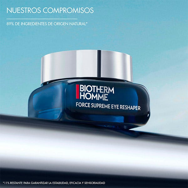 Biotherm Force Supreme Eye Reshaper es un contorno de ojos antiarrugas y efecto lifting para hombres, es una crema que actua sobre las patas de gallo, las líneas de expresión y los párpados caídos con tecnología multi-lifting. Formualda con Biotech Plankton™, Proxilane aumentado, Hexa-Peptido 8 y cafeína, refuerza el colágeno, suaviza las líneas finas de expersión, reduce la hinchazón e ilumina el contorno de los ojos.
