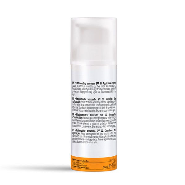 Fotoprotector facial bronceador SPF30 que protege frente a UVA y UVB y ayuda a conseguir un bronceado uniforme y saludable.