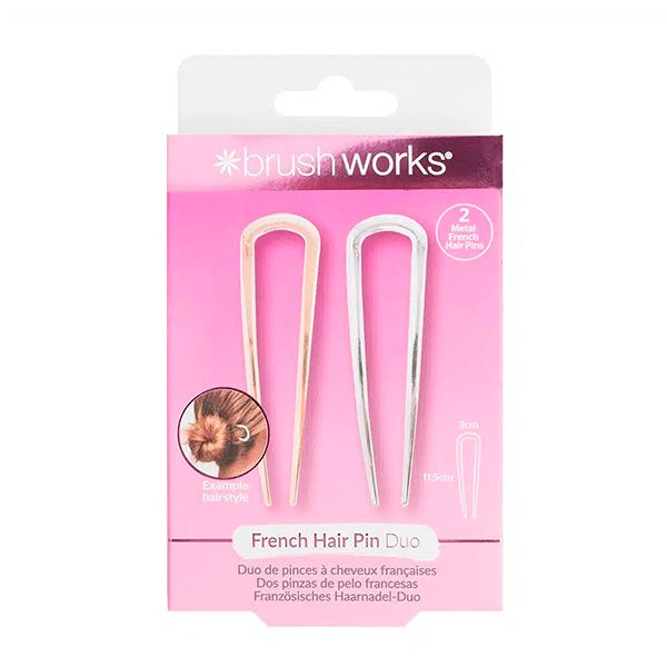Mejora tu peinado con el dúo de horquillas francesas de Brushworks: ¡la solución chic y sencilla para crear peinados espectaculares en segundos! Ya sea que busques un recogido informal o un moño elegante, estas horquillas facilitan el peinado. Simplemente gira, recoge y tu look quedará perfecto al instante. Las horquillas tienen un diseño minimalista y delgado que ofrece una sujeción segura.