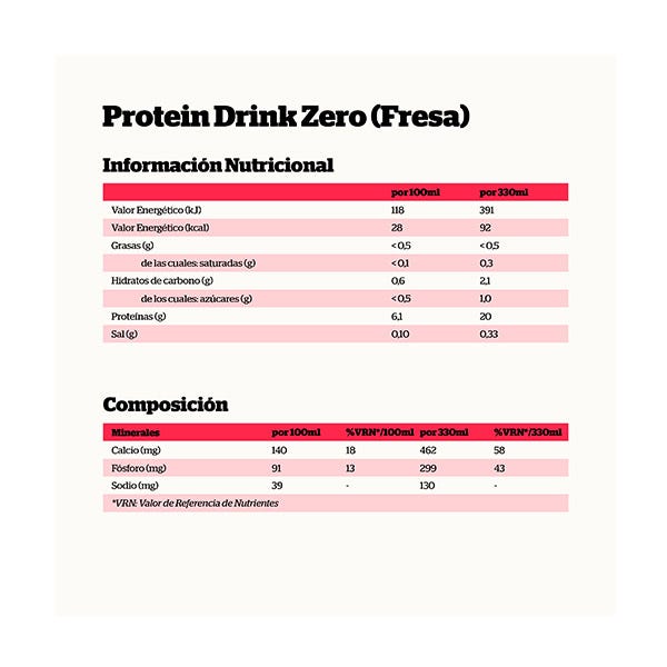 Agua, proteínas de la leche (7,0%), aromas, sal, espesante (carragenanos), estabilizante (fosfato dipotásico), edulcorantes (acesulfamo potásico, sucralosa), colorante (E-120).