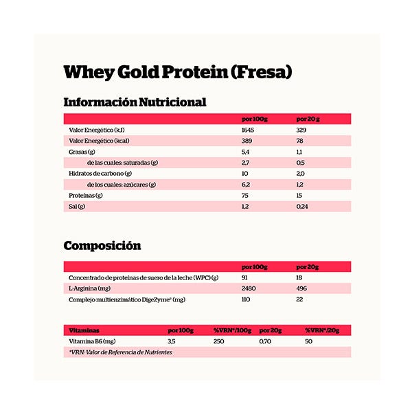 Ingredientes: Concentrado de proteínas de suero de la leche (Whey Protein Concentrate) (91%), fresa deshidratada en polvo (4,2 %), L-arginina clorhidrato, aromas (contienen leche), sal, edulcorantes (acesulfamo potásico, sucralosa), complejo multienzimático DigeZyme® (0,11%)[alfaamilasa (Aspergillus oryzae), proteasa (Bacillus subtilis), lactasa (Aspergillus oryzae), lipasa (Rhizopus oryzae), celulasa (Trichoderma longibrachiatum), maltodextrina], colorante (E-120), clorhidrato de piridoxina (vitamina B6).