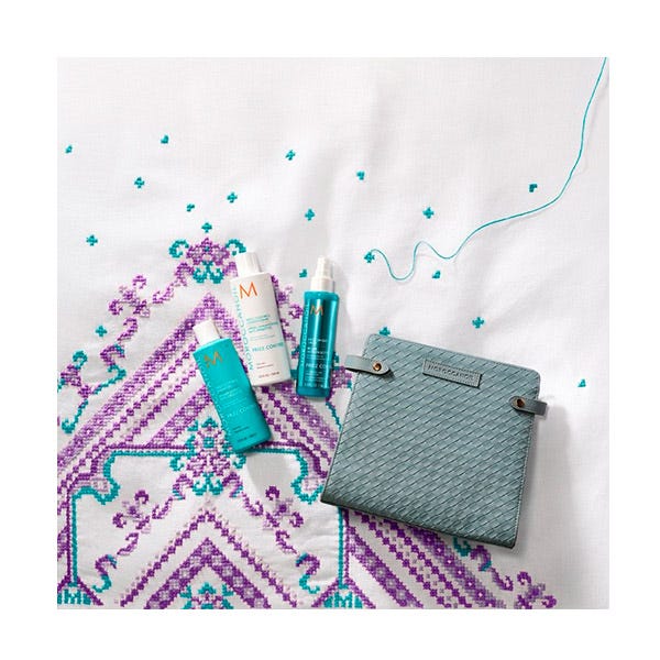 Este neceser, atemporal, elegante y resistente, viene con un kit de edición limitada de productos en tamaño completo para controlar el encrespamiento. Con la inconfundible fragancia de Moroccanoil e infusionado con extracto de yaca para aumentar la resistencia al encrespamiento y péptidos de amaranto que ayudan a evitar el daño.