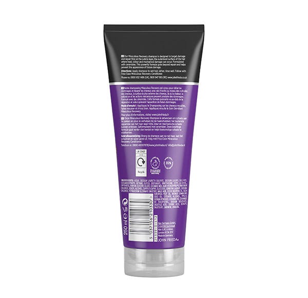 Aplicar el Champú Reparador Miraculous Recovery en el cabello mojado, masajear suavemente y aclarar con abundante agua.