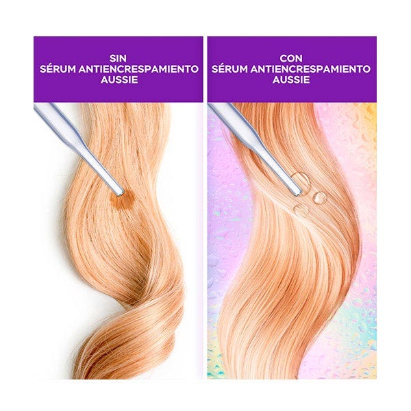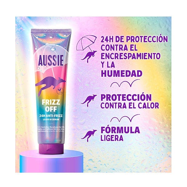 ¿Listo para decirle adiós frizz?! Di hola al pelo suave con el Frizz Off 24H Anti-Frizz Leave-In Serum de Aussie. Enriquecido con aceite de nuez de macadamia australiano, jojoba y aceites de cártamo, esta fórmula ligera retiene la humedad, protege contra el calor y combate la humedad durante 24 horas. No más frizz, pelos sueltos o hebras pesadas, solo pelo suave, brillante y de gran olor, incluso en los días más lluviosos.