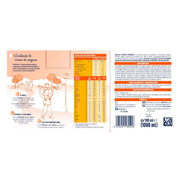 Meritene FUERZA Y VITALIDAD Pack 6 briks de 180 ml con sabor a Vainilla es una solución nutricional en formato bebible listo para tomar. Su fórmula NutriPlus contiene proteínas, de alta calidad, vitaminas y minerales. Sus ingredientes permiten suplementar la dieta, contribuyen a disminuir el cansancio y la fatiga y al funcionamiento normal del sistema inmunitario.