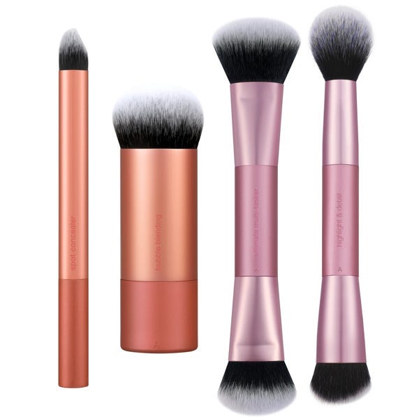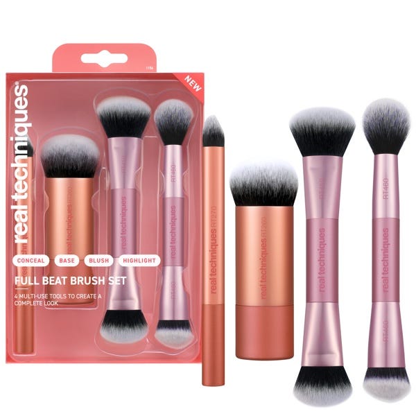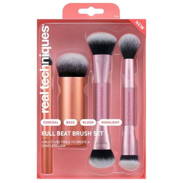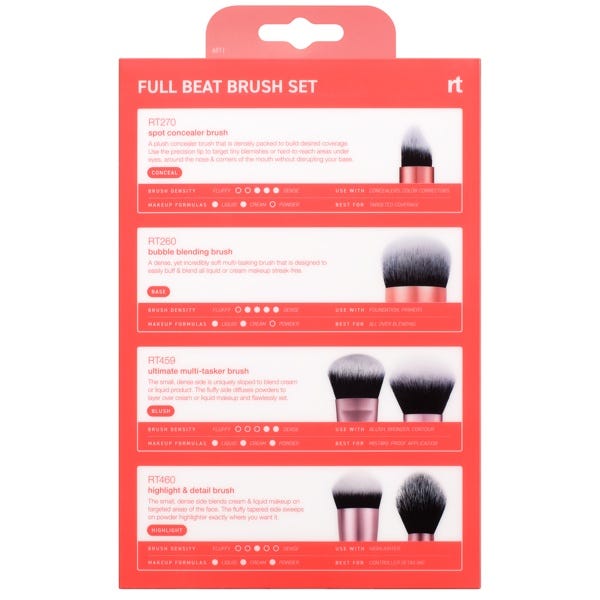 El set Real Techniques Full Beat Brush Set tiene todo lo que necesitas para lograr un look glam completo, desde la base hasta el acabado final. Este set de 4 piezas incluye la RT 270 Spot Concealer Brush para cobertura localizada, la RT 260 Bubble Blending Brush para pulir y difuminar, la RT 459 Ultimate Multi-Tasker Brush para aplicar y sellar, y la RT 460 Highlight & Detail Brush para una aplicación precisa del iluminador.