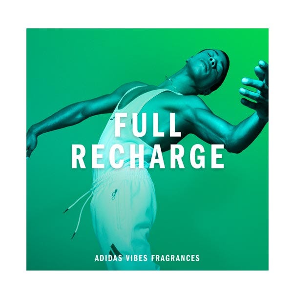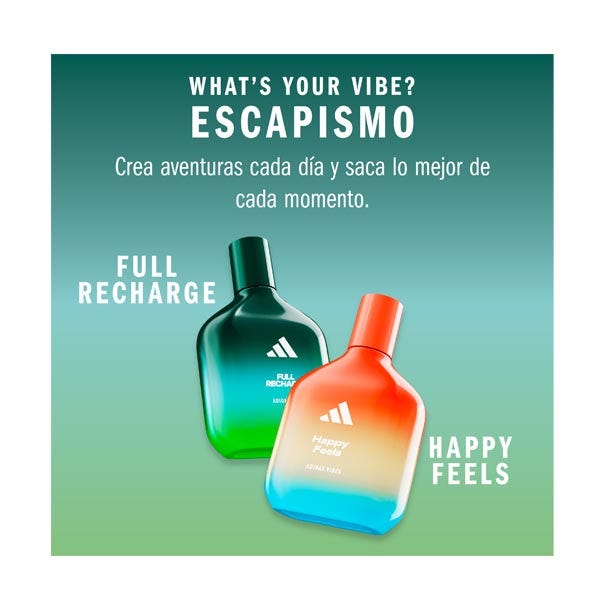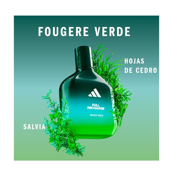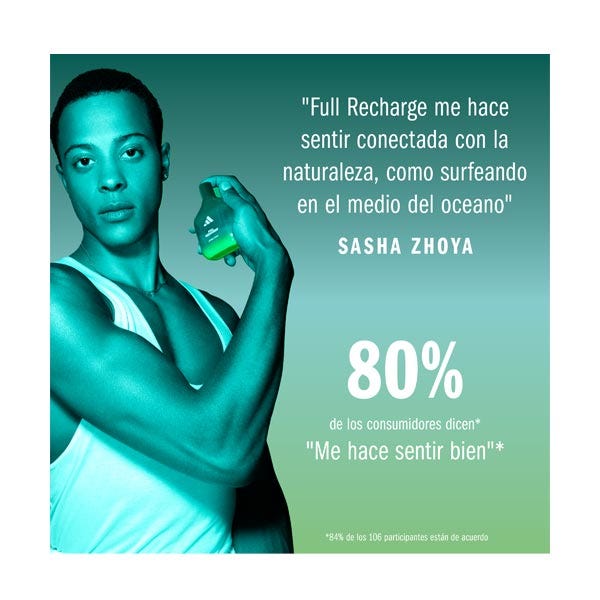 Está demostrado que el perfume Adidas Vibes Full Recharge transmite energía positiva*. Con notas frescas y revitalizantes de hoja de cedro y salvia sclarea, como un fin de semana fuera de la ciudad y en conexión con la naturaleza.