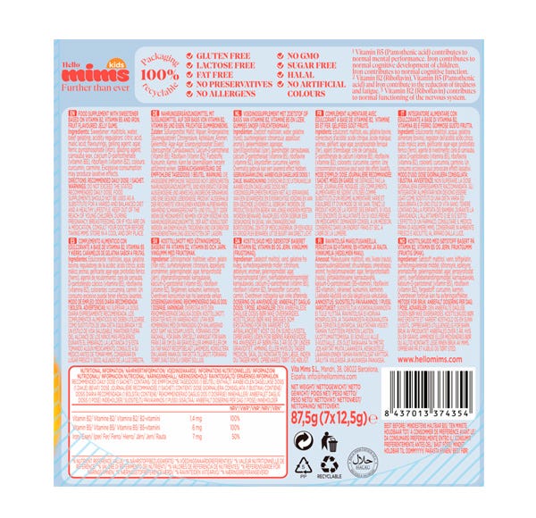 Gominolas sin azúcar con vitaminas y minerales: contribuye al desarrollo cognitivo del niño y mejora su rendimiento mental ayudando también a su autoestima.