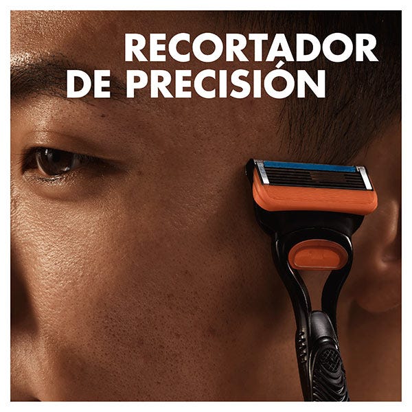Maquinilla de Gillette con 5 hojas antifricción para un afeitado imperceptible y apurado.El recortador de precisión de la parte trasera, que es perfecto para esos pelos rebeldes en las zonas de difícil acceso.