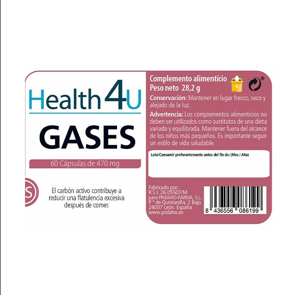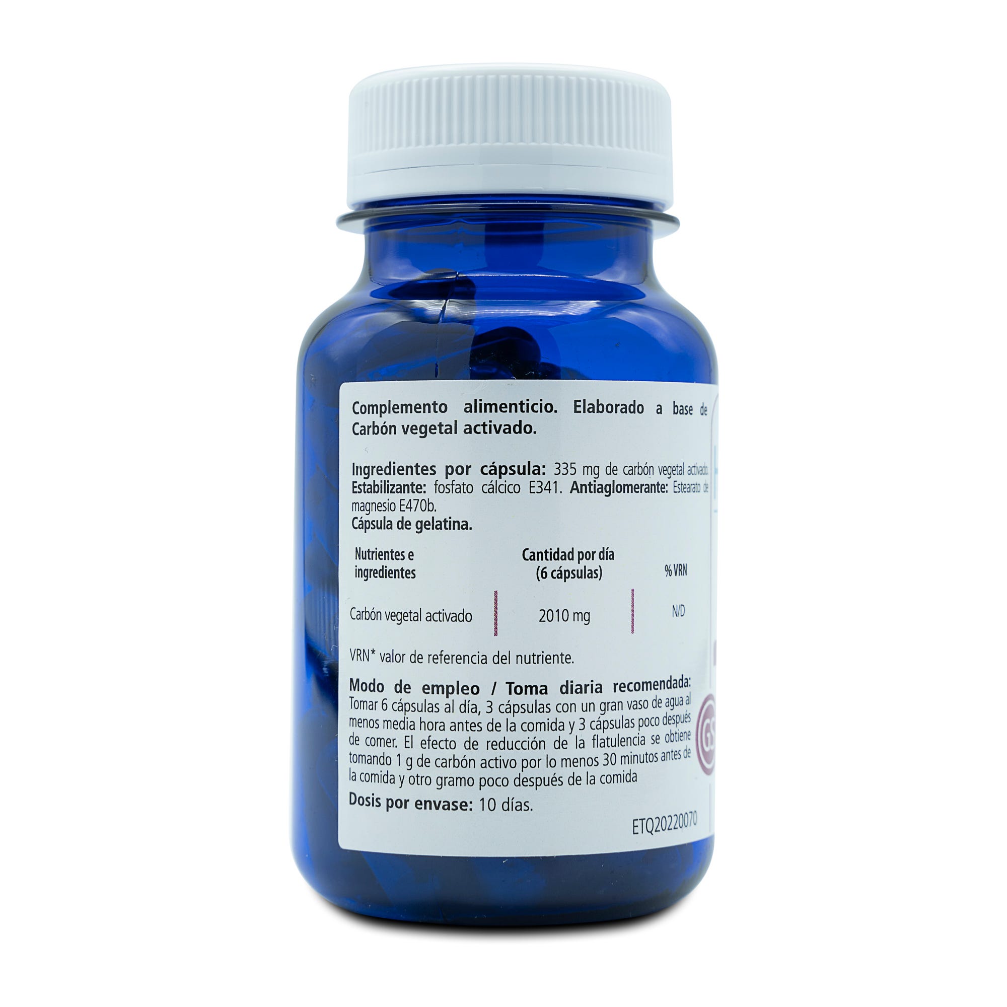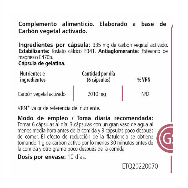 Ingredientes por capsula: 335 mg carbon vegetal activado.Estabilizante: fosfato calcico E341. Antiaglomerante: Estearato de magnesio E470b. Capsula de gelatina.