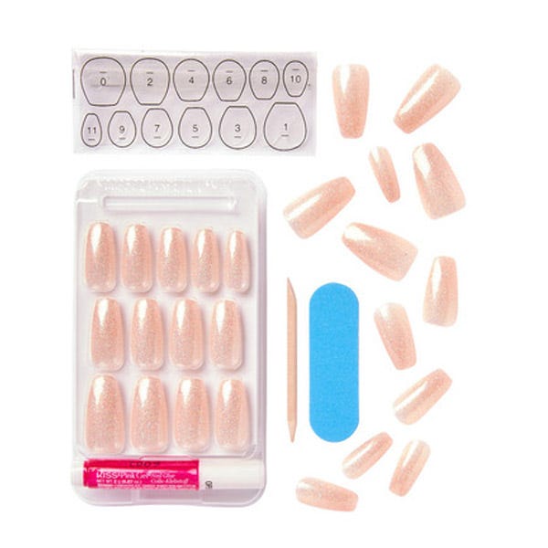 Contiene 24 uñas, 24 pestañas megaadhesivas, pegamento de gel rosa (2g), stick de manicura y mini lima.