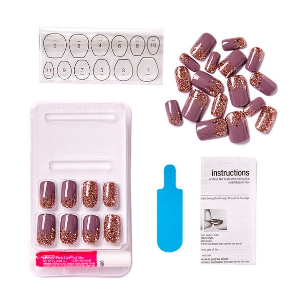 Contiene 24 uñas, 24 pestañas megaadhesivas, pegamento de gel rosa (2g), stick de manicura y mini lima.