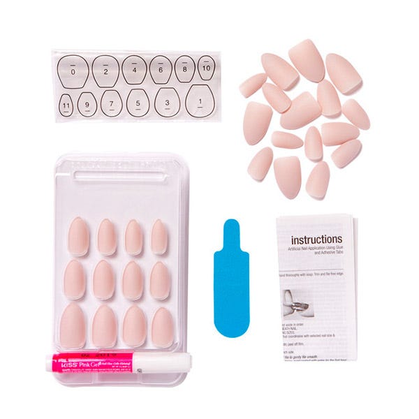 Contiene 28 uñas, 28 pestañas megaadhesivas, pegamento de gel rosa (2g), stick de manicura y mini lima.