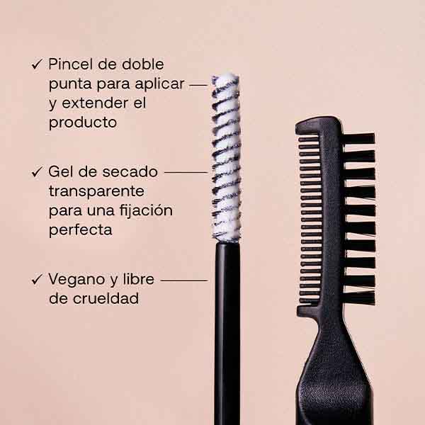 Brocha de doble punta para aplicar el producto y dar forma a las cejas con el cepillo.