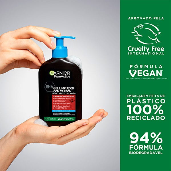 Garnier Pure Active Gel Limpiador Anti Puntos Negros enriquecido con BHA (Ácido Salicílico) y Carbón de origen natural, purifca la piel, reduce granitos y puntos negros y previene su reaparición para una piel limpia y matificada.