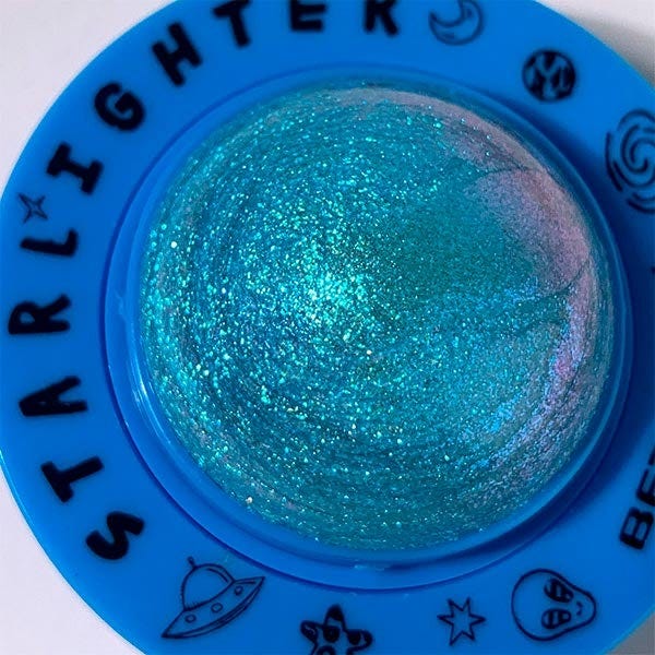 Bálsamo labial hidratante y 2 iluminadores con acabado iridiscente en forma de planeta.