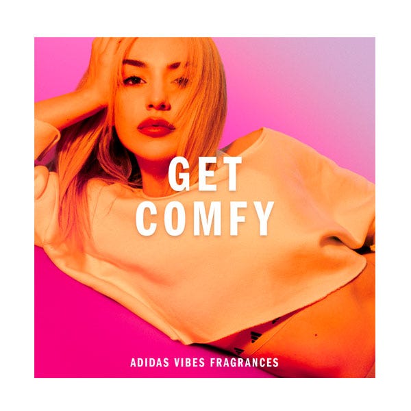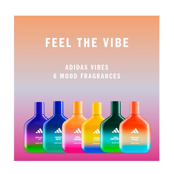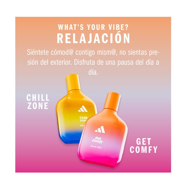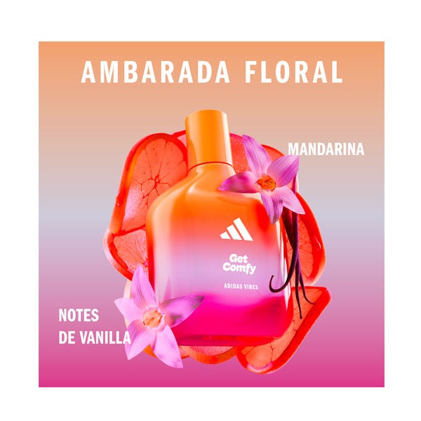 Está demostrado que el perfume Adidas Vibes Get Comfy transmite energía positiva*. Con notas calmantes y cálidas de vainilla y mandarina, este perfume es perfecto cuando quieres pasar el rato y relajarte cómodamente.