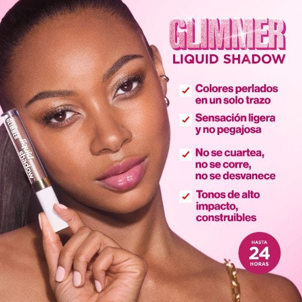 Glimmer. Shimmer. Shine. NUEVA Revlon Glimmer Liquid Shadow™: sombra de ojos líquida que aporta un color perlado, luminoso y multidimensional en un solo paso. Se aplica, se difumina y se seca uniformemente para una mirada impactante durante 24 horas. Su refrescante fórmula a base de agua resiste a la grasa, con un color vibrante que no se cuartea, se corre ni se desvanece.