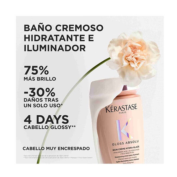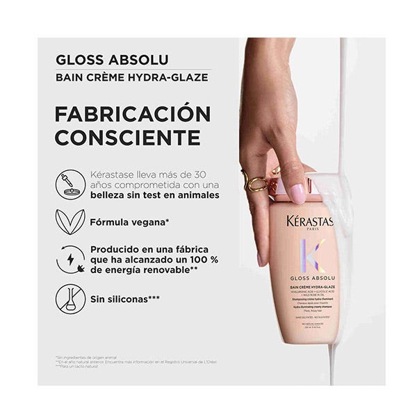 Bain Crème Hydra-Glaze de Kérastase es un baño cremoso hidratante e iluminador para cabello muy encrespado sin sulfatos (sin tensioactivos sulfatados). Está específicamente formulado con ácido hialurónico, ácido glicólico y aceite de rosa silvestre para nutrir intensamente el cabello. Te proporciona un cabello glossy, con brillo y ligero.