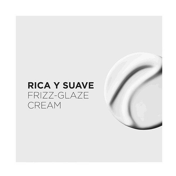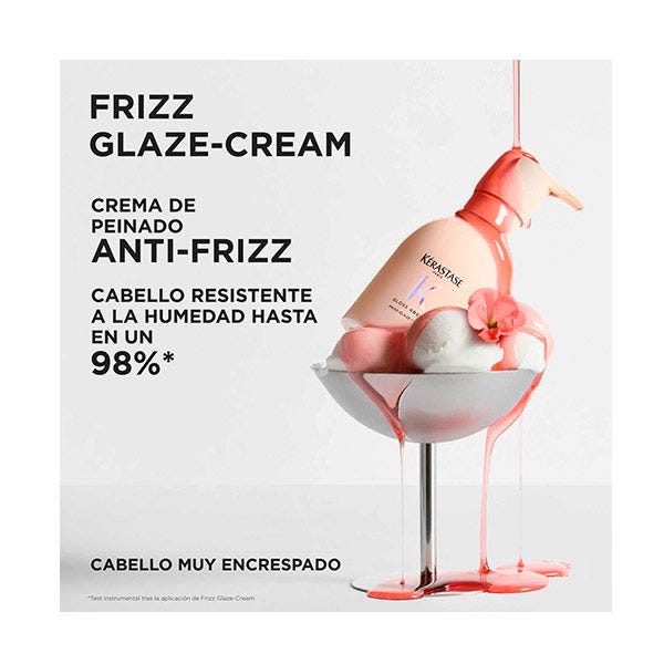 Frizz-Glaze Cream de Kérastase es una crema de peinado antiencrespamiento para cabello muy encrespado. Está especialmente formulada con glicerina, ácido hialurónico, ácido glicólico y extracto de rosa silvestre para proporcionar un peinado sin encrespamiento durante 4 días, incluso en condiciones de alta humedad y calor.