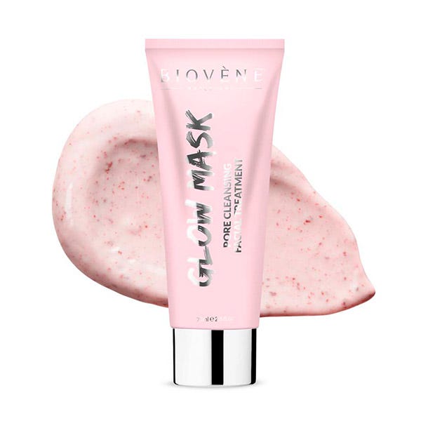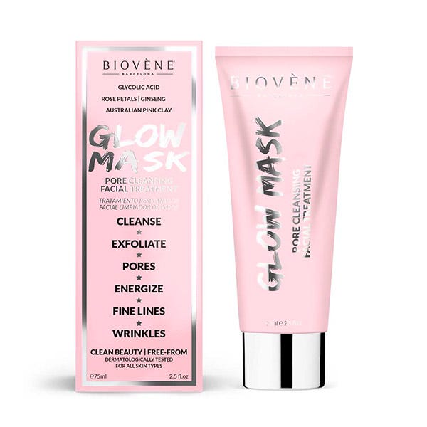 La mascarilla exfoliante facial glow maskcon ingredientes estrella Arcilla rosa australiana, Ácido glicólico, Ginseng y Pétalos de rosa fortalece y energiza la piel para un brillo radiante y ayuda a minimizar la apariencia de los signos del envejecimiento.