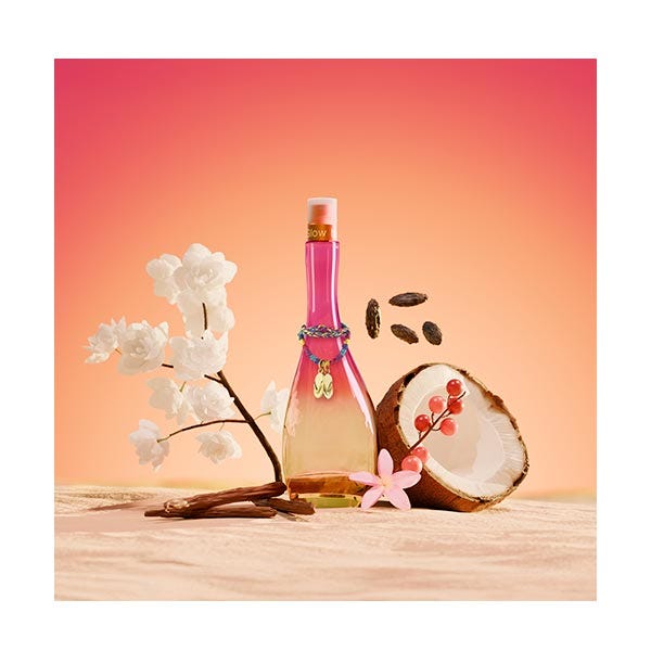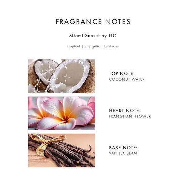 Glow by JLo Miami Sunset captura la magia de Miami cuando el día se transforma en noche. Jugosas notas de arándano, agua de coco y durazno abren la fragancia, mientras un corazón de exótica frangipani, jazmín y un acorde de arena cálida envuelve los sentidos. La base de vaina de vainilla, absoluto de tonka y benjuí te sumerge en el alegre y tropical resplandor de un atardecer en Miami.