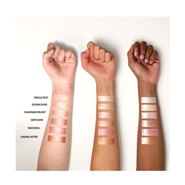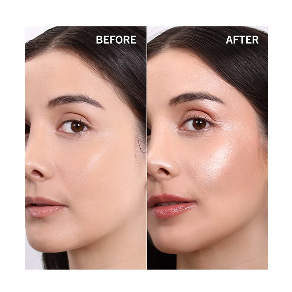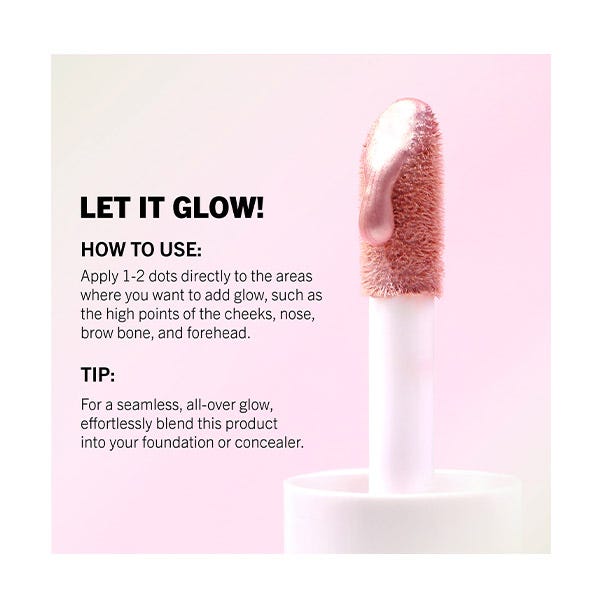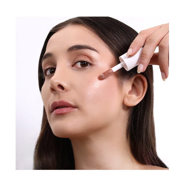 Iluminador: Aplica el maquillaje como de costumbre. Añade una pequeña cantidad de Glow Show Liquid Highlighter en el área deseada, como la parte alta de las mejillas, el puente y la punta de la nariz, la esquina interna de los ojos y el arco de Cupido. Difumina con la punta de los dedos.