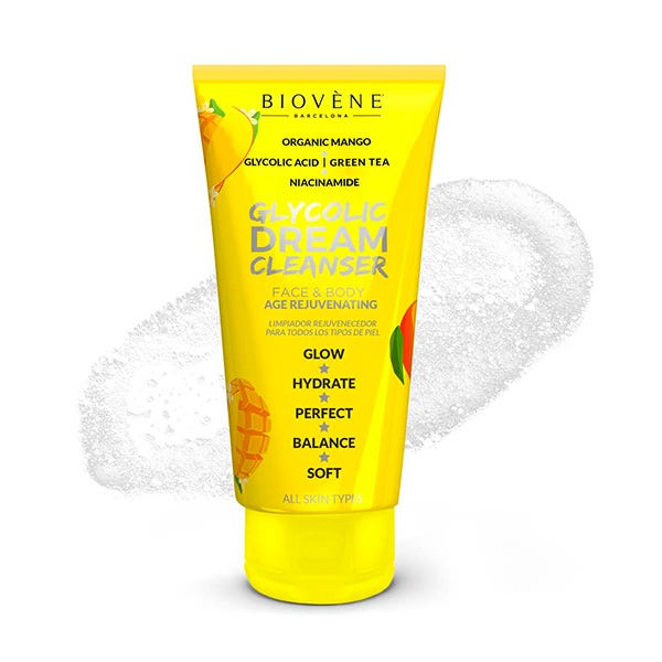 El limpiador rejuvenecedor de la edad para el rostro y el cuerpo con ácido glicólico y mango orgánico exfolia la piel y elimina eficazmente las impurezas, el aceite y la suciedad, dejando la piel suave, hidratada y con un brillo natural.