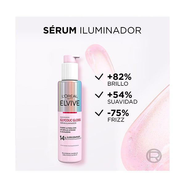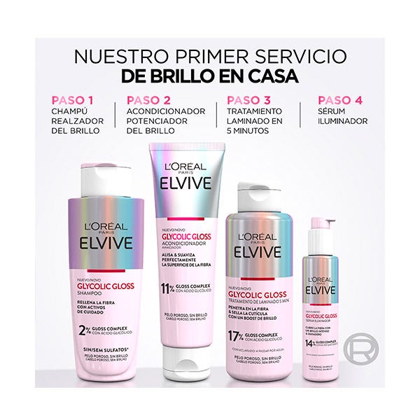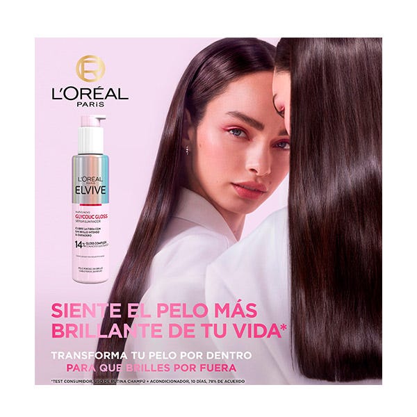 Elvive Glycolic Gloss de L’Oréal Paris es un tratamiento de laminado capilar que revoluciona tu rutina de cuidado con resultados visibles en solo 5 minutos. Su fórmula cremosa con un 17% de Gloss Complex y ácido glicólico penetra profundamente en la fibra capilar, sella la cutícula y transforma el cabello opaco en una melena con un brillo espejo espectacular. Ideal para cabello seco o poroso, repara el daño, suaviza la textura y aporta un acabado sedoso y saludable. Su tecnología de laminado proporciona resultados que duran hasta 5 lavados, convirtiéndolo en un imprescindible para quienes buscan un boost de brillo, suavidad y vitalidad sin esfuerzo.