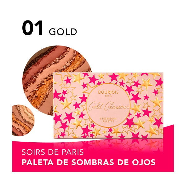 Consigue looks irresistibles y llenos de glamour con la paleta de sombras de ojos Gold Glamour Soirs de Bourjois. Esta paleta esencial ofrece 8 tonos deslumbrantes, que van desde un oro beige radiante hasta un negro dorado intenso, ideales para crear una mirada sofisticada y de larga duración. Su fórmula innovadora, que se transforma de cremosa a polvo, garantiza una aplicación suave y sin pliegues ni transferencias. Con colores altamente pigmentados, podrás construir y difuminar las sombras con facilidad, logrando acabados mate, brillante o metálico, y adaptando tu estilo de día a noche con un toque de elegancia parisina.