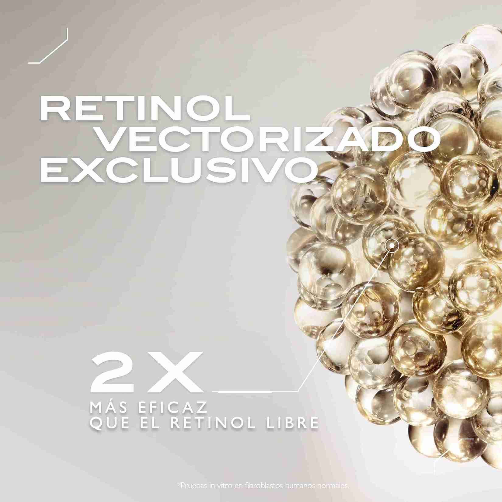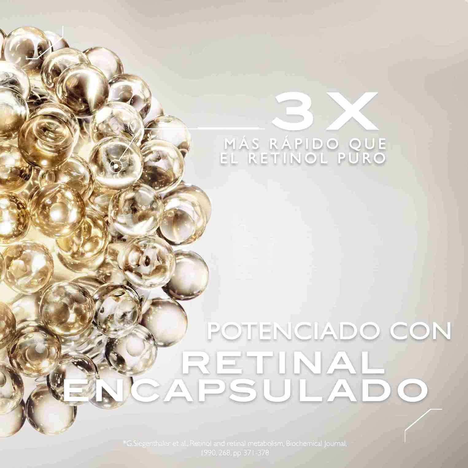Impulsado por una tecnología de vanguardia, nuestro tratamiento anti edad efecto lifting para el contorno de los ojos combina una mezcla de alto rendimiento de [Retinol y Retinal], cada uno de ellos encapsulado en un sistema de suministro avanzado, y un [Complejo de Dipéptido] remodelado de nueva generación. Una combinación única diseñada para ir más allá de la regeneración del colágeno, que ayuda también a restaurar la función de las fibras elásticas. Nuestra tecnología avanzada ha demostrado aumentar la producción de elastina en un 158 %* y las fibras de colágeno en un 50 %*.