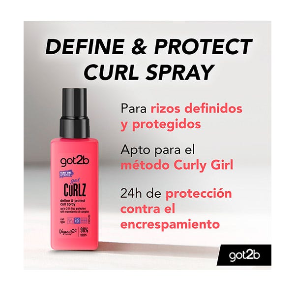 El Spray Curlz Define & Protect Got2b aporta una protección de hasta 24h contra el encrespamiento y perfecta definición de rizos.