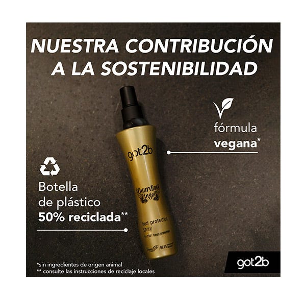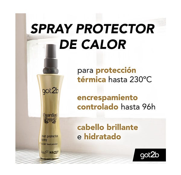 Got2b Spray Guardian Angel con una protección de hasta 220 grados, tu cabello puede soportar el calor de planchas planas, rizadores y secadores de pelo. Además añade brillo a tu cabello.