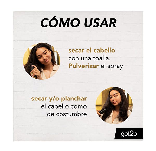 Vaporiza sobre el cabello seco y utiliza plancha o rizador.