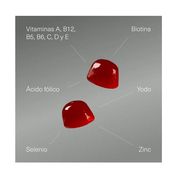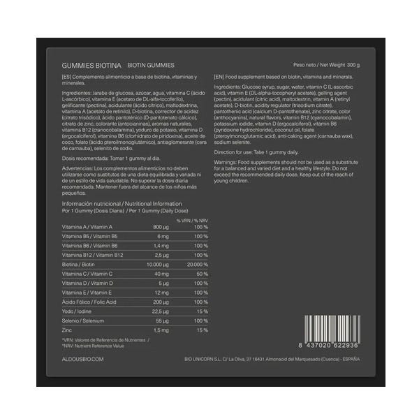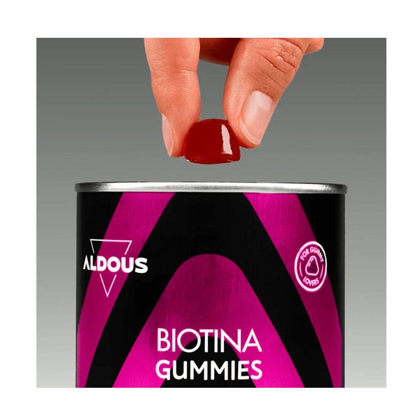 La potente combinación de Biotina con Acido Folico, Zinc, Selenio, Yodo + Vitaminas B, C, D, E, A Aldous en formato gominola es una opción cómoda y sencilla de consumir Biotina. Un formato fácil de tomar con sabor a cereza, aromas naturales y un bajo contenido en azúcar. No contiene gelatina ni excipientes.