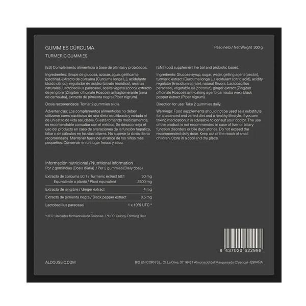 Sirope de glucosa, azúcar, agua, gelificante (pectina), extracto de cúrcuma (Cúrcuma longa L.), acidulante (ácido citrico), regulador de acidez (citrato trisódico), aromas naturales, Lactobacillus paracasei, aceite vegetal (coco), extracto de jengibre (Zingiber officinale Roscoe), antiaglomerante (cera de carnauba), extracto de pimienta negra (Piper nugrum)