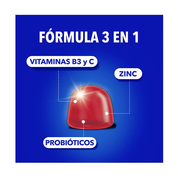 Jarabe De Glucosa; Azúcar; Agua; Vitamina C (Ácido L-Ascórbico; L-Ascorbato Sódico), Agente Gelificante: Pectina; Niacina (Nicotinamida), Reguladores De Acidez: Ascorbato Sódico; Citrato Trisódico; Colorante Alimentario (Concentrado De Zanahoria Negra); Citrato De Zinc, Cepa Probiótica: Bacillus Coagulans SNZ 1969; Maltodextrina; Aroma Natural De Frutos Rojos Con Otros Aromas Naturales, Estabilizador: Ácido Cítrico, Agente De Recubrimiento: Cera De Carnauba