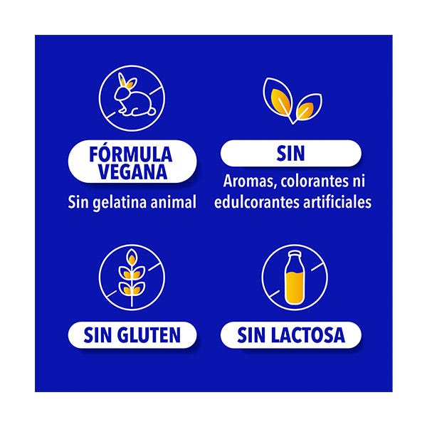 SIN: Sin gluten ni lactosa. Sin gelatina animal, saborizantes, colorantes ni edulcorantes artificiales. Fórmula vegana. Con sabor a frutos rojos.