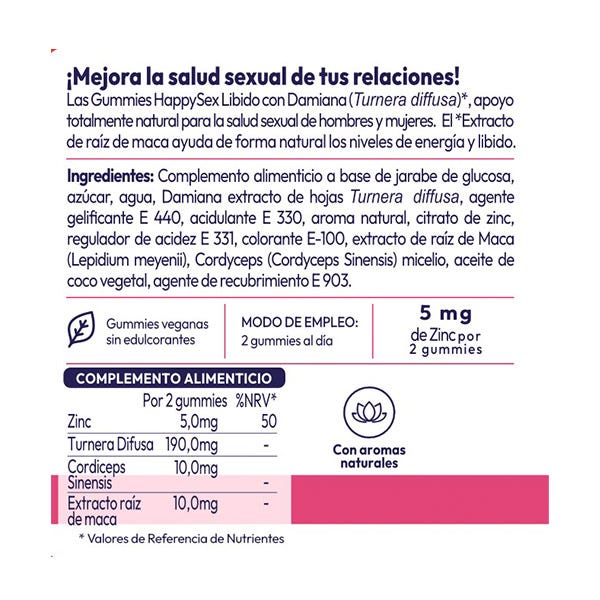 Gummies Happy Sex Libido formuladas con ingredientes naturales y extracto de Maca, reconocidos por sus propiedades para estimular la libido y mejorar el bienestar sexual.