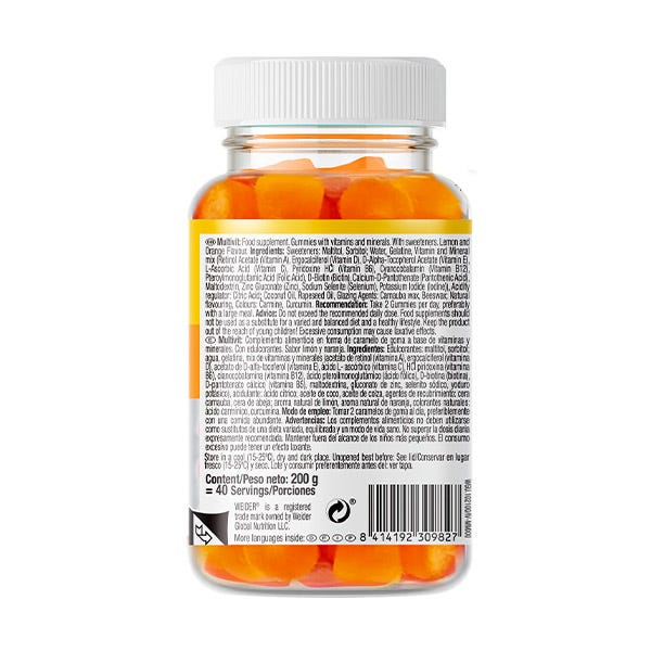 Edulcorantes: maltitol, sorbitol; agua, gelificante: gelatina; mix de vitaminas y minerales (vit. A: acetato de retinol; vitamina D: ergocalciferol; vitamina E: acetato de D-alfa-tocoferol; vitamina C: ácido L-ascórbico; vit. B6: HCl piridoxina; vitamina B12: cianocobalamina, ácido fólico: ácido pteroilmonoglutámico; biotina: D-biotina; vitamina B5: D-pantotenato cálcico; maltodextrina, gluconato de zinc, selenito sódico, yoduro potásico), acidulante: ácido cítrico; agente de recubrimiento: cera carnauba, cera de abeja; colorantes naturales: ácido carmínico, curcumina.