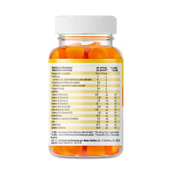 La fórmula de Multivit es súper completa. Tomar dos caramelos de goma diarios de Multivit proporciona el 65% del aporte de estas vitaminas y minerales, hasta 9 vitaminas y 3 minerales implicadas en algunas de las funciones más importantes del cuerpo:
