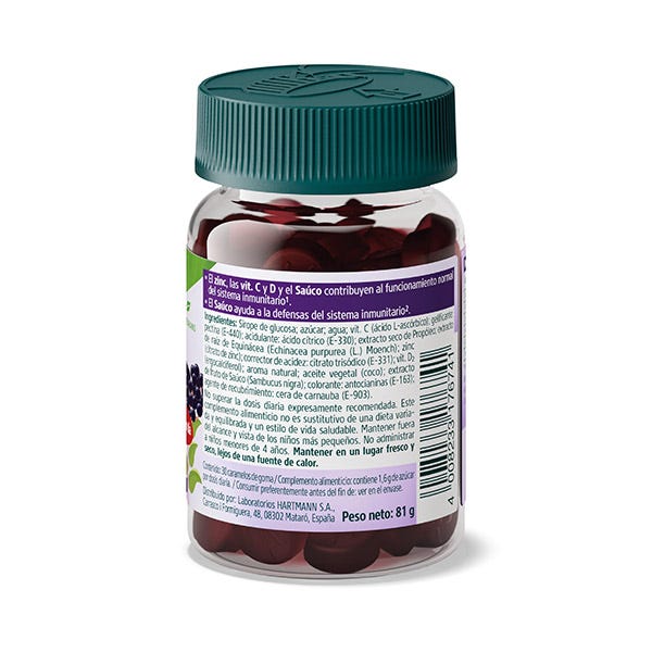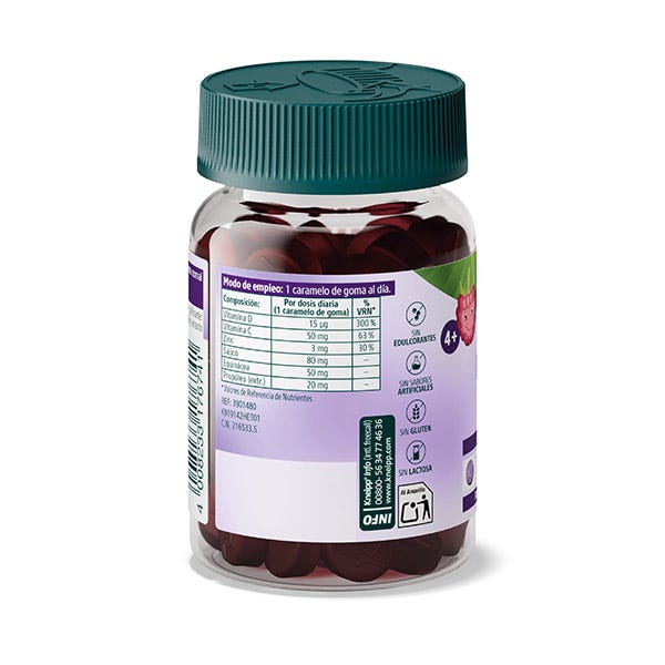 Ingredientes: Sirope de glucosa; azúcar; agua; vit. C (ácido L-ascórbico) (E-440); acidulante: ácido cítrico (E-330); extracto seco de propóleo; extracto de Echinácea (Echinacea purpurea (L.) Moench); zinc (gluconato de zinc); corrector de acidez: citrato trisódico (E-331); aroma de fresa (aroma natural); colorante: antocianinas (E-163); extracto seco de Saúco (Sambucus nigra); colorantes: antocianinas (E-163); agente de recubrimiento: cera de carnauba (E-903).