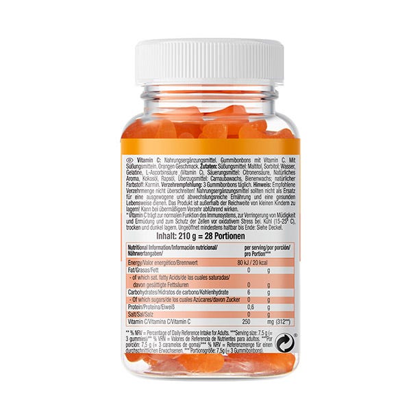 Vitamin C es 100% libre de gluten, sin azúcar y ha sido elaborado con colorantes y aromas naturales. Una dosis de 3 gummies al día proporcionan hasta el 250% de la vitamina C que proporcionaría la di