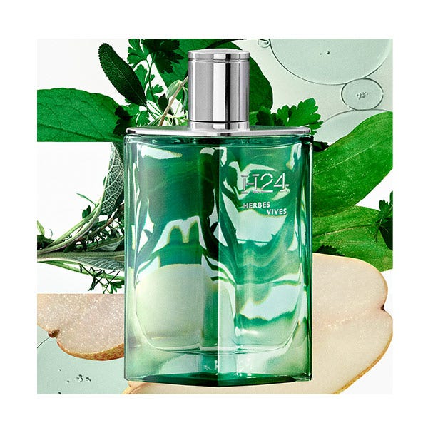 H24 Herbes Vives eau de parfum combina la fuerza de un ramo de hierbas frescas, la textura de un granizado de pera y la vivacidad de una molécula de alta tecnología, Physcool®.