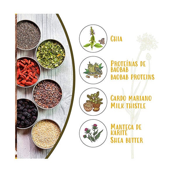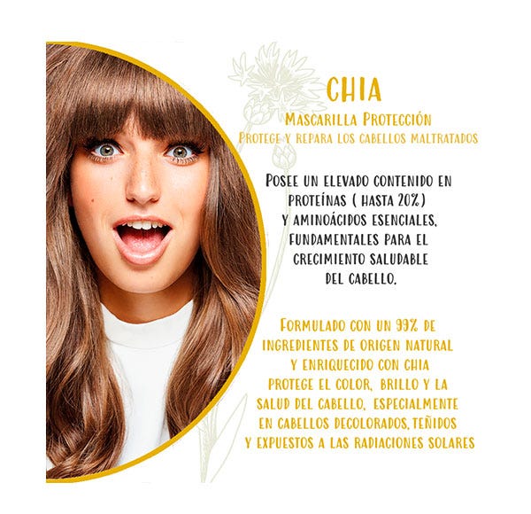 - Chía: superalimento rico en proteínas y aminoácidos esenciales, vitaminas B, D y E. Es una excelente fuente de calcio, magnesio, hierro, zinc, boro y niacina. Protege las fibras capilares del daño oxidativo generado por la radiación solar, creando una película protectora que evita la pérdida de proteínas provocada por las radiaciones UV.