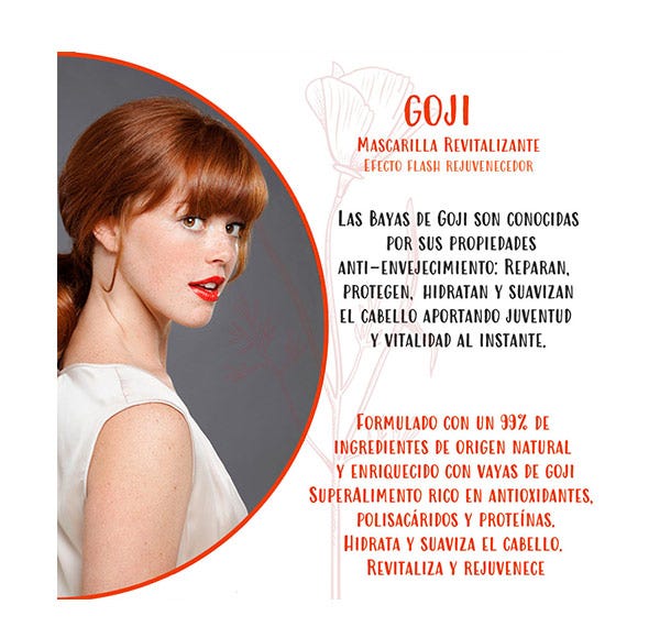 Las Bayas de Goji son un superalimento conocido por sus propiedades anti-envejecimiento, gracias a su alta capacidad antioxidante. Repara, protege, hidrata y suaviza el cabello aportando juventud y vitalidad al instante.